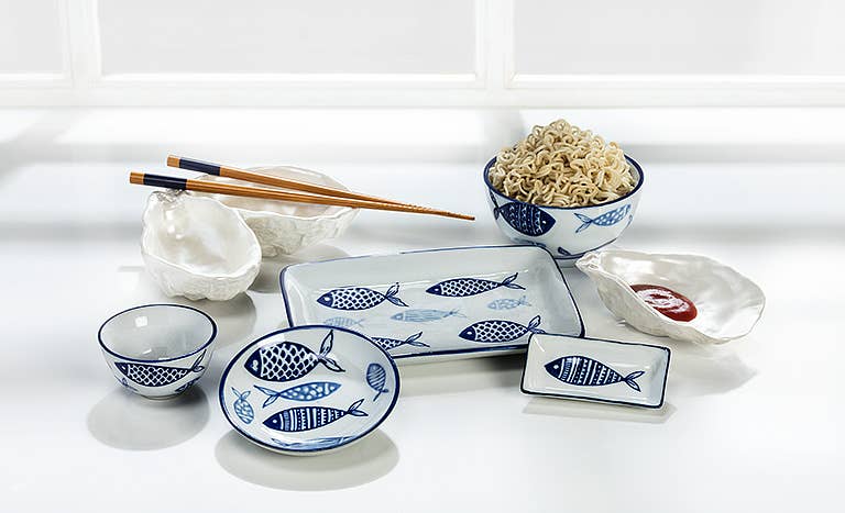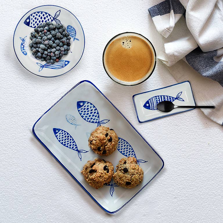 When you're serving seafood, match your dishware to your dinner with this stylish Small Rectangle Sauce Dish. Crafted out of white porcelain with blue accents, this elegantly simple dish features a primitivist art-style fish at the center — a delightful complement to anything you serve, whether fish or fowl. Matching serving plates are also available.